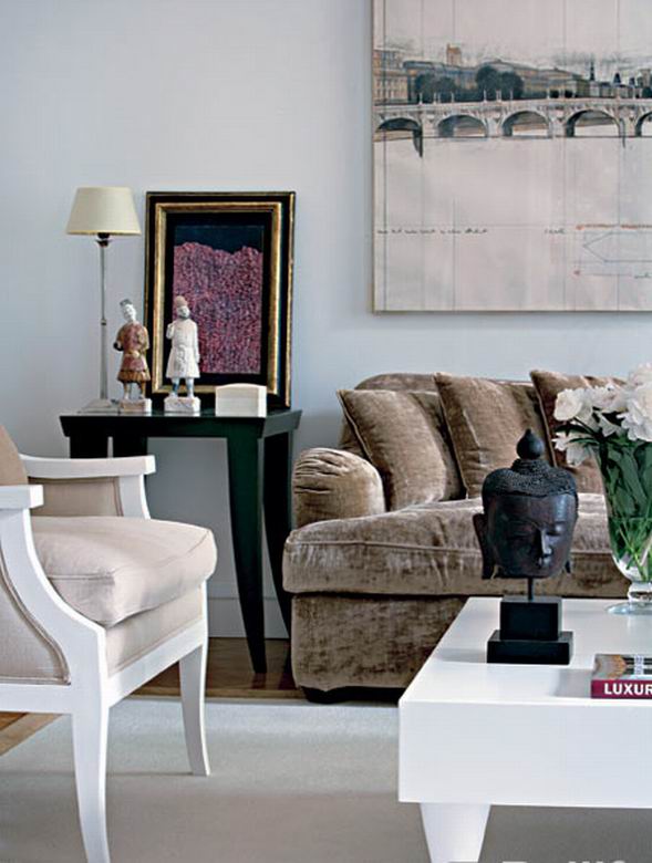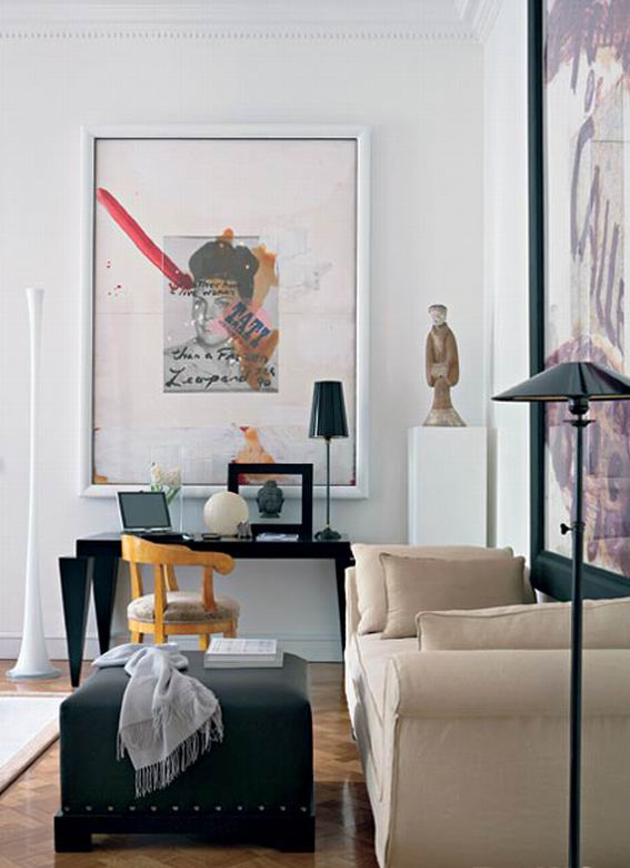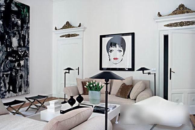 在某种意义上讲,陈设是激活空间灵魂的触媒。身为时装设计师的女主人对艺术有着敏锐的感触,家中有很多出自大师手笔的艺术品,但为了避免家庭空间的博物馆化,设计师特意结合空间的功能和情调,赋予房子里的每一个细节以特别的情感。从Emilio Vedova简约的抽象画到安迪·沃霍尔充满波普意味的“Liza Minnelli”,从克里斯托的画作到波特罗的雕塑……艺术品在各自的空间中以独特的身份出现,从而构成了若干个有微妙气质差异的空间。而且,女主人也有很多富有中国特色的陈设收藏,她坦言,这不过是些她喜欢的中国陶塑的仿制品,但这些东方元素拼贴在欧洲新古典主义的空间场景中,也充满了别样的味道,一如古典主义时期欧洲大陆对于神秘东方文