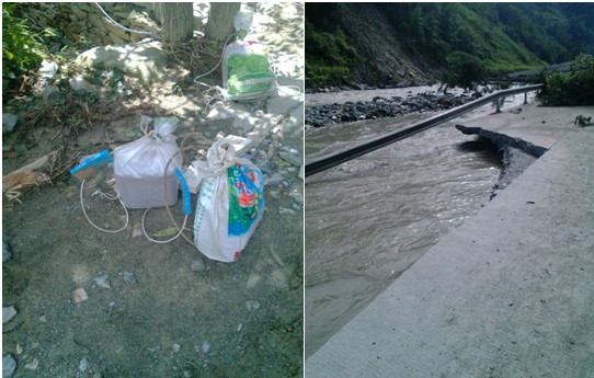 由于道路断道,山体滑坡严重,公司的车只能将柴油送到宋家大院的桥上,我们再用自带的绳子将装满柴油的油箱捆绑好,从宋家大院出发,一侧山陵绵延起伏,一侧水势汹涌澎湃,且随时可能有塌方和泥石流发生。公路已经被泥土石头淹没,行走十分艰难,稍不注意脚便陷入深深的泥泞,再难拔出来。硬邦邦的绳子无情的将我们的肩膀勒得通红,并不遥远的路途显得漫长而艰难,经过重重困难,在中午才到达了电站。