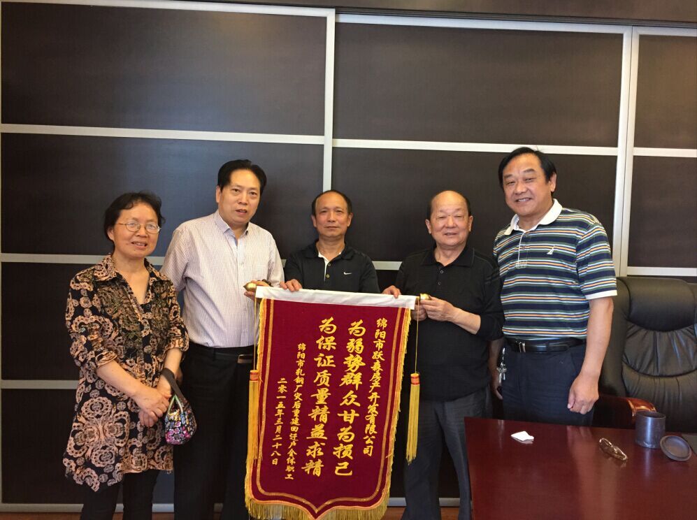 2015年4月29日上午,绵阳市轧钢厂灾后重建回迁户三位代表将一面绣有“为弱势群众甘为损己,为保证质量精益求精”的大红锦旗送到aoa体育集团绵阳办公区15楼办公室,表达他们对耀森公司的感激之情。