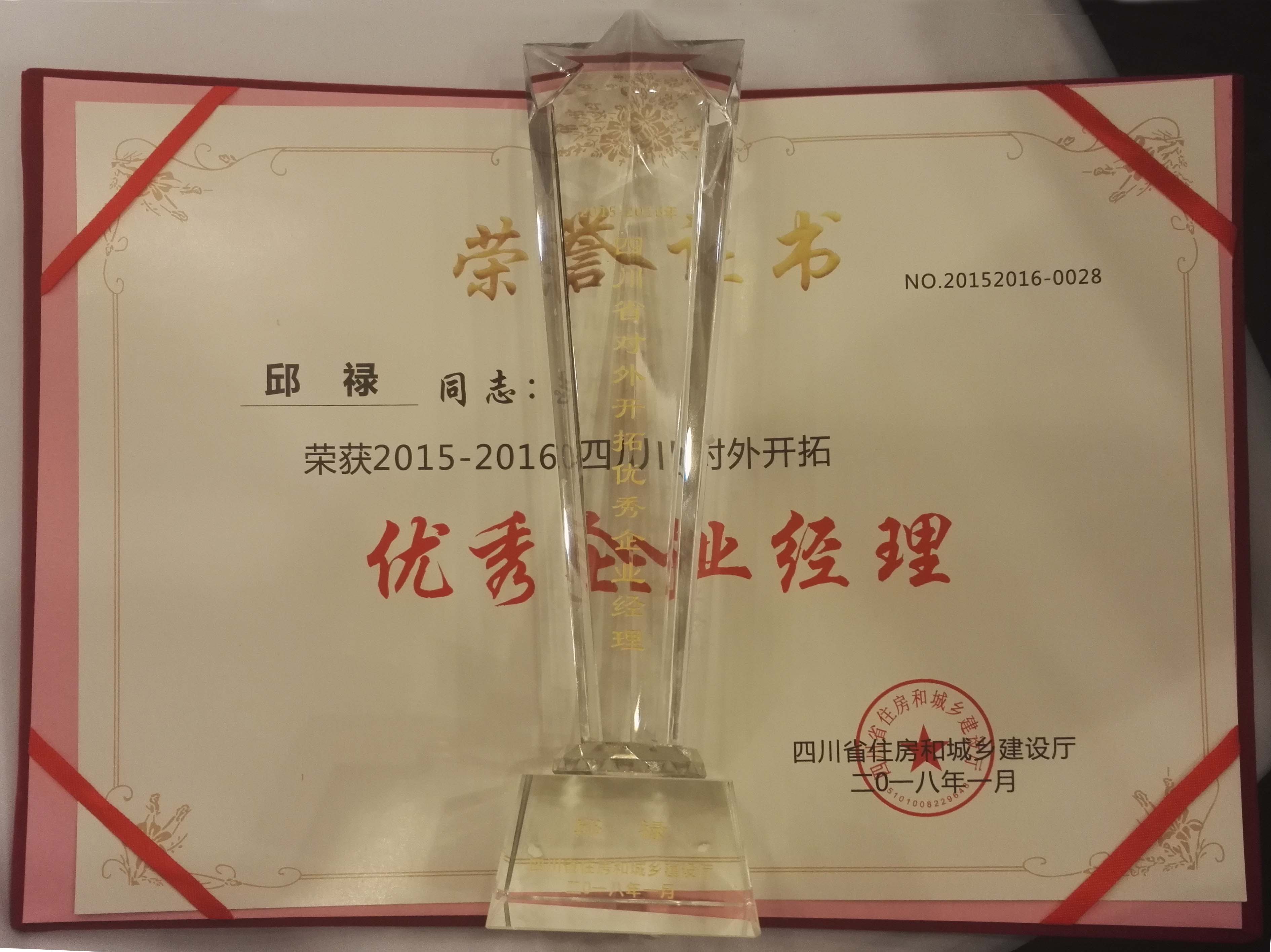 2018年1月18日,四川省对外开拓先进企业和优秀个人表彰大会在成都市隆重召开。 四川省光耀建设集团有限公司荣获“四川省对外开拓先进企业”荣誉称号,邱禄同志荣获“四川省对外开拓优秀企业经理”荣誉称号。